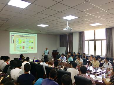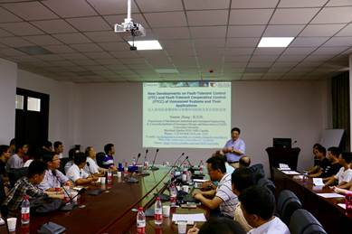 研讨会首先由许斌教授做主题为“不确定情形高超速飞行器快速自适应控制”的报告,在报告中许斌教授从高超速飞行器的应用及定义入手,详细介绍了该飞行器的控制原理、特点和关键技术;其次Prof. Youmin Zhang介绍了“New Developments on Fault-Tolerant Control (FTC) and Fault-Tolerant Cooperative Control (FTCC) of Unmanned Systems and Their Applications(无人系统的容错控制与容错协同控制及其应用新进展)”,Prof. Zhang在报告中对无人系统的发展和应用进行了综述,并指出无人系统控制面临的共性问题,让大家对无人系统有了全新的认识;接下来会议由Prof.Junmin Wang做关于“Control and Estimation of Vehicle Systems toward Clean, Efficient, Safe, and Smart Mobility”的主题报告,Prof. Wang的报告从清洁、高效能源方面详细阐述了目前智慧交通所面临的机遇和挑战,并且深入浅出地分析了地面交通系统的特征、计算、通讯能力、控制和估计理论;研讨会最后由我院“百人计划”特聘教授Prof. YangQuan Chen做关于“From MAS-net (mobile actuator and sensor networks) to CPS (cyber-physical systems) and from HC-CPS (human-centric CPS) to CHS (cyber-human systems)”的主题报告,就多机器人控制研究的前沿问题和发展前景进行了介绍。主题报告之后,与会人员进行了广泛交流。
