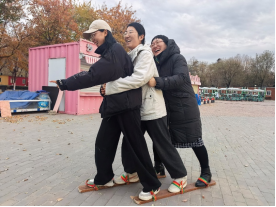 紧接着的板鞋竞速比赛更添紧张与趣味。辅导员们脚踩长板鞋,双手紧紧扶住前面队友的肩膀,脚掌与板鞋精准同步起落,各队伍稳步向前。从赛前的“慢步找节奏”到比赛中的“快步冲终点”,大家在一次次调整中加深信任,在彼此的呼喊与鼓劲中突破速度瓶颈。当冲过终点线的瞬间,无论是领先的队伍还是稍慢的队伍,都笑着拥抱彼此,汗水与笑容交织间,不仅释放了平日学生工作的疲惫,更让团队凝聚力在每一次同步的步伐中悄然增强。