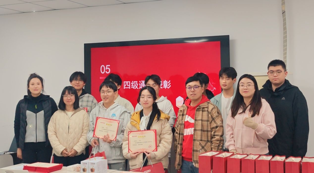 为全面夯实学院学风建设基础,总结英语四级培训教学成果,表彰优秀备考学子,激励全院学生积极备战英语四六级考试,近日,机电工程学院召开英语四级培训班总结表彰会。学院学工办主任高珊、团委书记安春雨、辅导员张晓君三位老师共同为2025年下半年通过大学英语四级考试的优秀学生代表颁发荣誉证书与精美奖品,传递学院对学子英语学习的重视与鼓励。
