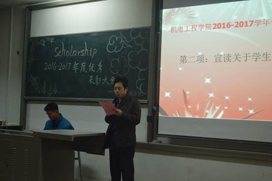 2017年12月14日晚6点,我院在教1-201成功举办了2016-2017学年优秀表彰大会。出席本次大会的嘉宾有我院党委书记赵玉厚、院党委委员张晖、院学生党总支副书记薛鹏、院团委书记唐雅莉及学院各年级辅导员老师。